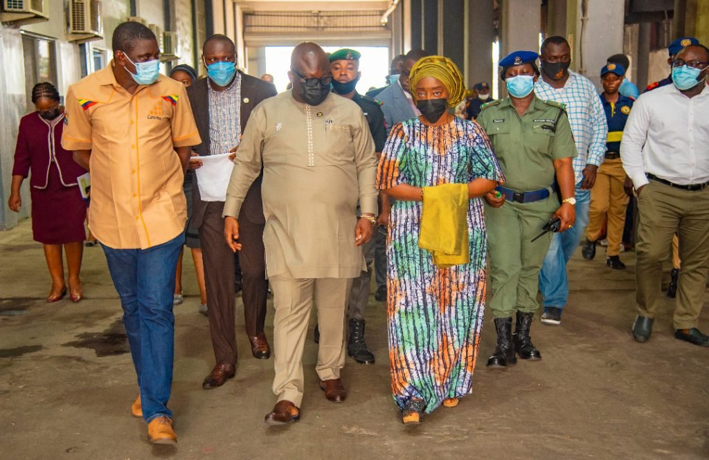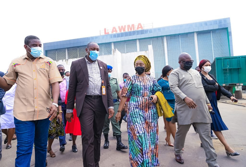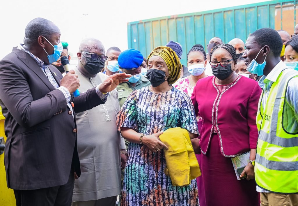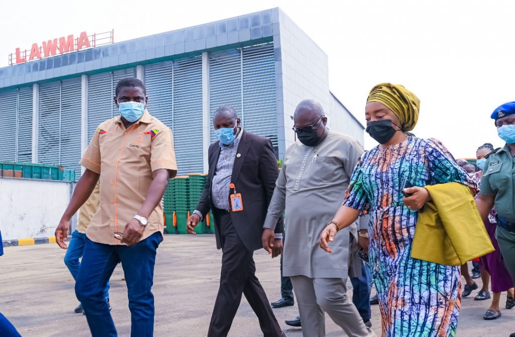 The Managing Director/CEO, Lagos Waste Management Authority, Mr. Ibrahim Odumboni, today, showing the Lagos State First Lady, Dr. (Mrs.) Ibijoke Sanwo-Olu, round the medical waste facility and the bins’ showroom, for “Adopt-A-Bin” project, at LAWMA’s Simpson Transfer Loading Station (TLS), Lagos island.