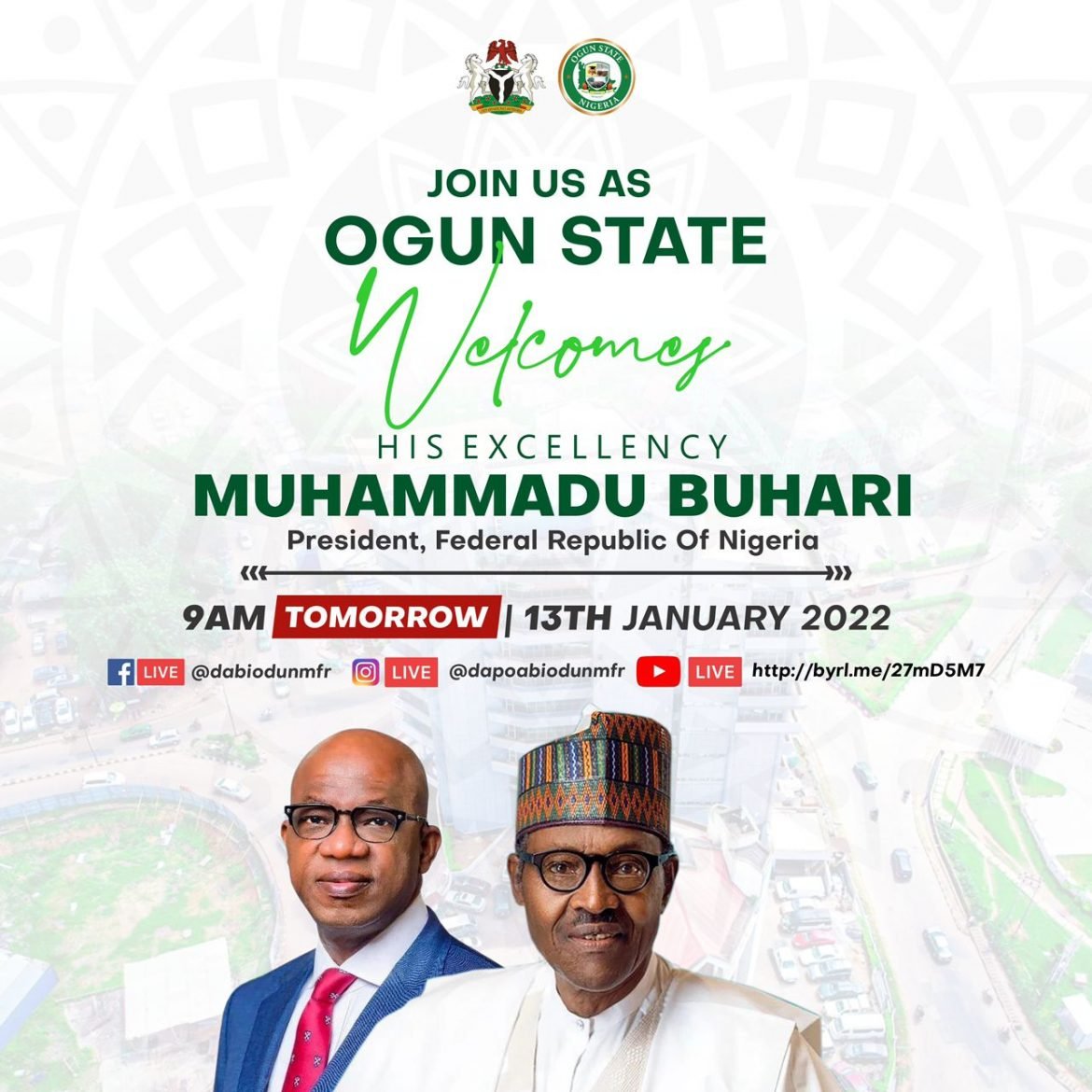 President Muhammadu Buhari will undertake a one-day official visit to Ogun State on Thursday, January 13, 2022, to commission landmark projects undertaken by the State Governor Prince Dapo Abiodun.