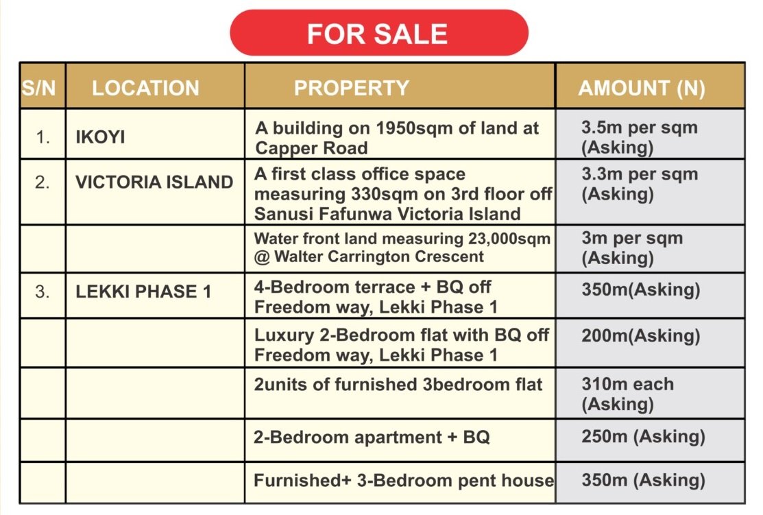 * Two units of Furnished 3-Bedroom Flats: ₦310 million each (asking)