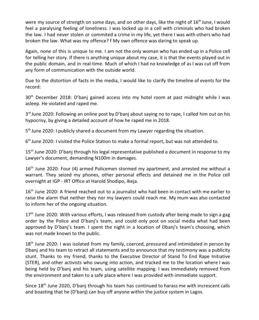 Seyitan Babatayo, the lady who accused singer Dbanj of raping her in 2018, has released a press statement. Seyitan explained how the police arrested her and kept her in cell for 2 days. She also talked about how Dbanj’s team allegedly took her to an unknown location, seized her phones, deleted all her tweets, and told her to tweet what they want.