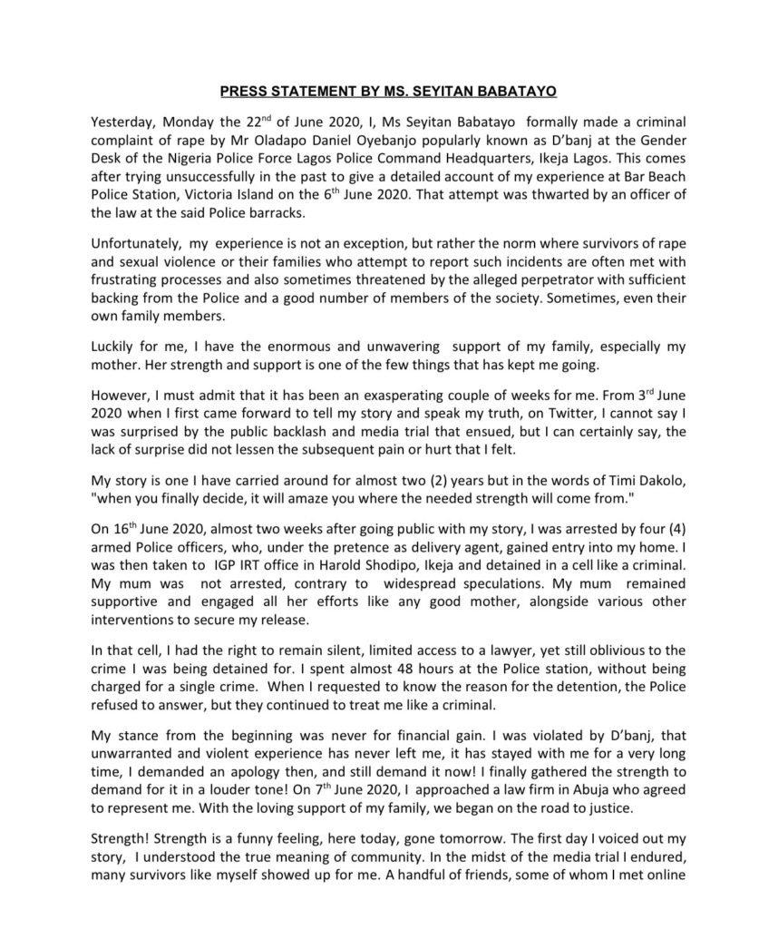 PRESS STATEMENT: Ms Seyitan Babatayo on her criminal complaint of rape against Mr Oladapo Daniel Oyebanji and the timeline of events since she shared her experience. pic.twitter.com/NB9qqUhdKP