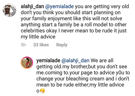 Yemi then felt the urge to go to his page to see what a ‘responsible family man’ does on his page. Alas! He bleaches. So the singer replied him telling him, everyone gets old, but it will do him better if he changes his bleaching cream.