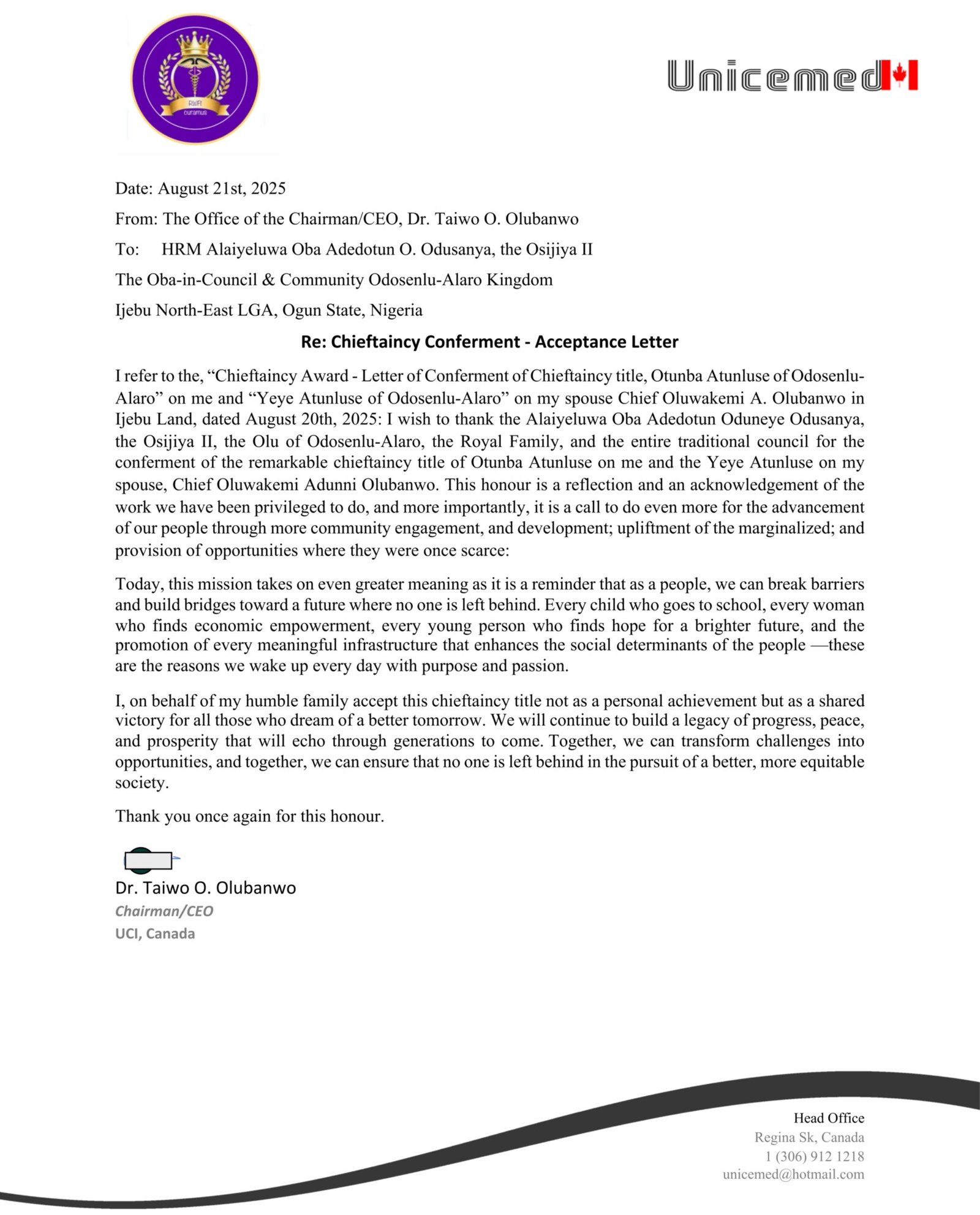 As the Odosenlu-Alaro Kingdom prepares to formally celebrate the conferment, there is a sense of pride among the people that their son, despite his global standing, remains rooted in service to his community.
