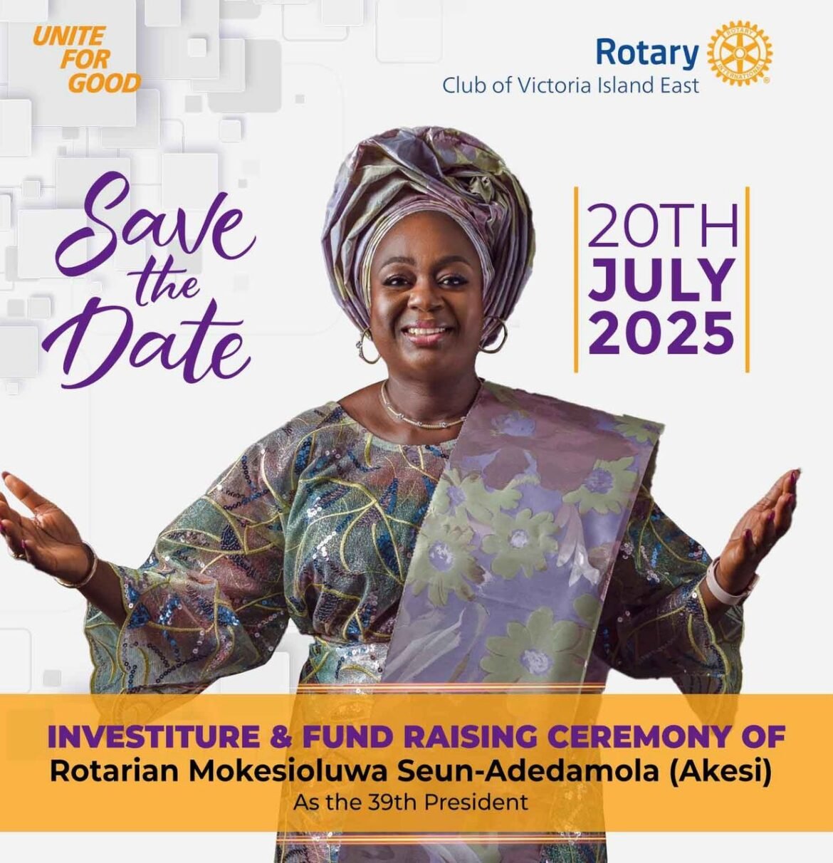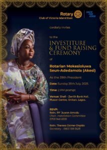 All roads will lead to the prestigious Shell Hall, MUSON Centre, Onikan, Lagos, at 2:00 p.m. on Sunday, July 20, as the Rotary Club of Victoria Island East hosts the swearing-in and fundraising ceremony for its 39th President, Rotarian Mokesioluwa Seun-Adedamola, PHF (fondly known as Akesi).