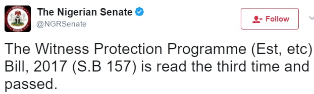 Nigerian Senate has today June 8, 2017, passed A bill to protect whistle-blowers, in an announcement made made available on its official Twitter handle.
