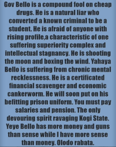 The comment came Wednesday as a political feud between the two former allies deteriorates, following an outbreak of violence at a political rally in Kogi, for which the two politicians blame each other.
