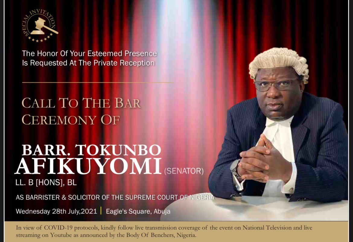 Former Abuja federal Lawmaker Senator TOKUNBO Afikuyomi will on Wednesday, July 28, 2021 join the league of learned lawyers.