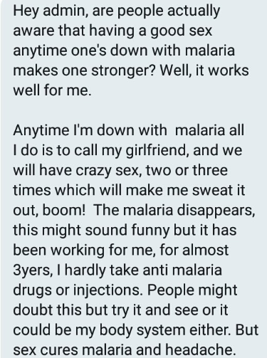 The young man claims that each time he notices he’s down with malaria, he calls his girlfriend for a romp and once he sweats in the process, his “malaria disappears”.
