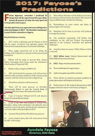 “See how Gov (Prophet) Ayodele Fayose predicted Senator Bukola Saraki’s victory at the Code of Conduct Tribunal (CCT). – See number 8. Today, like several of Gov Fayose’s predictions, the one on Saraki has come to pass.