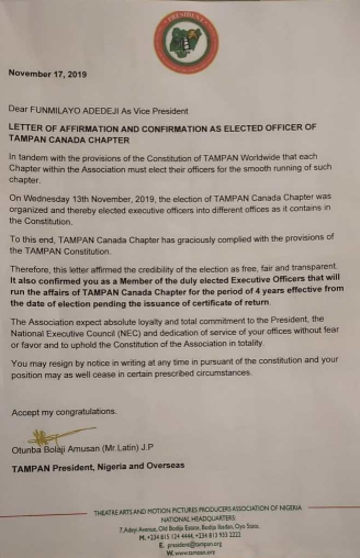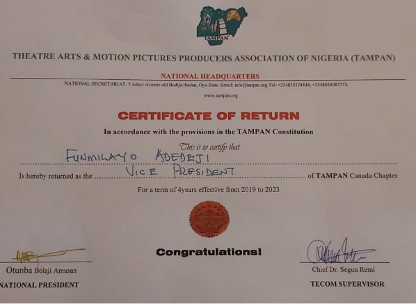 These are good times for Olori Funmilayo Adedeji, a professional Nolywood actress based in Canada, as the Theatre Arts and Motion Picture Practitioners Association of Nigeria (TAMPAN) has unanimously elected her as the Vice President of the highly revered association, Canada Branch.