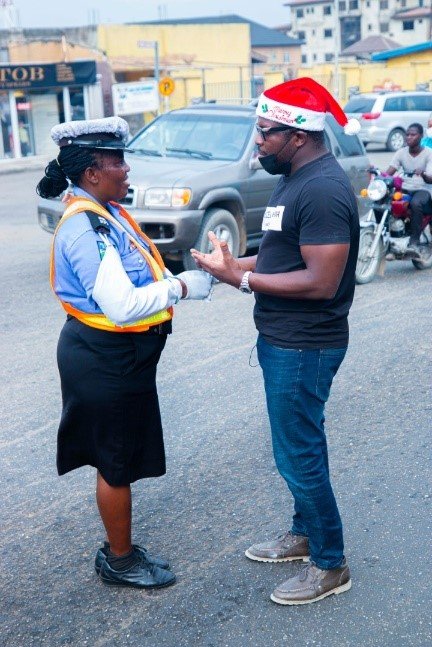 Another beneficiary of the Sujimoto Santa was a middle-aged traffic warden at Ogudu roundabout. A woman who is known in that community as a very committed and a dedicated traffic warden, never leaving her duty post, come rain or shine, always ensuring the traffic is smooth in that axis and she is known for always wearing a smile.