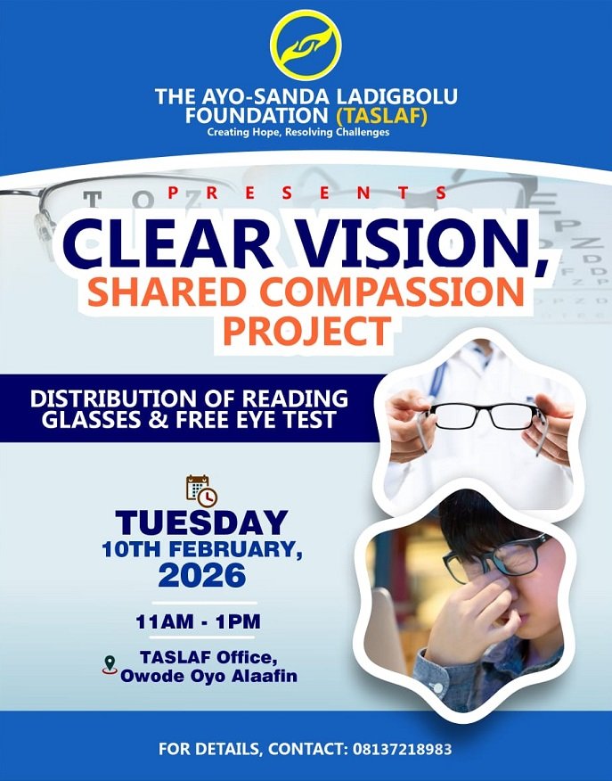 Residents of Oyo town are set to benefit from a free eye-care support initiative as the Ayo-Sanda Ladigbolu Foundation (TASLAF) rolls out its “Clear Vision, Shared Compassion Project.”
