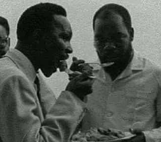 A rare photo of former Biafran leader Odumegwu Ojukwu and General Yakubu “Jack” Dan-Yumma Gowon, former head of the state of Nigeria eating together at a meeting attended by delegates of both the Federal Government of Nigeria and Eastern delegates to find a solution to the disunity has surfaced online.