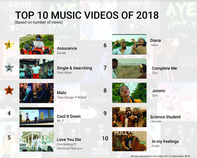 Assurance by Davido, Single & Searching by Yemi Alade and Malo by Tiwa Savage featuring Wizkid claimed the spot as “Top Music Videos” in Nigeria based on the number of views garnered.