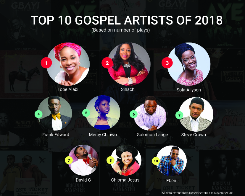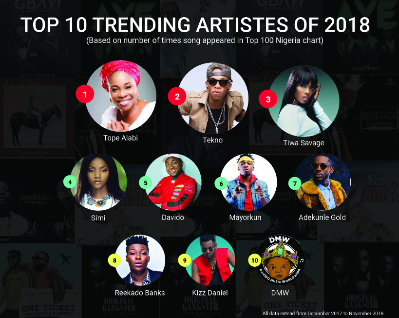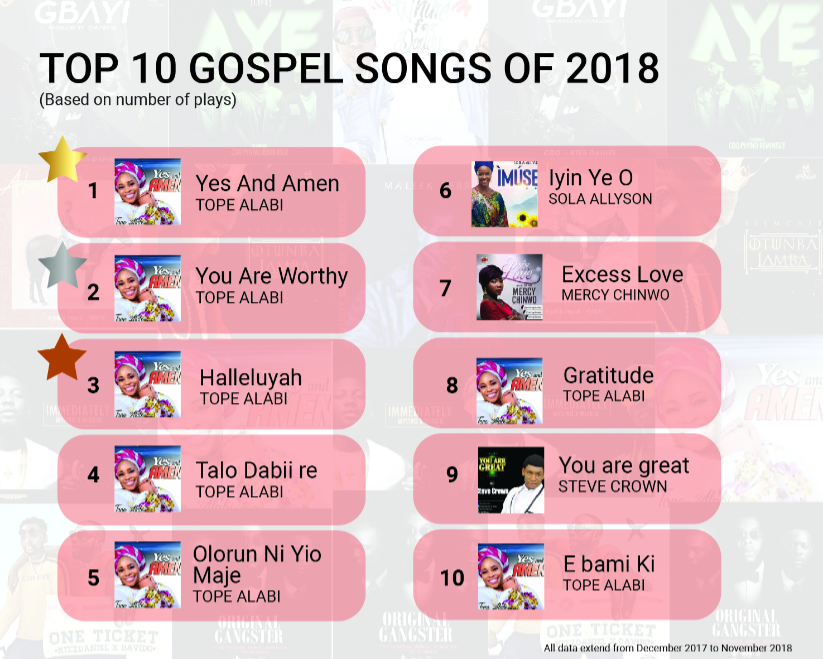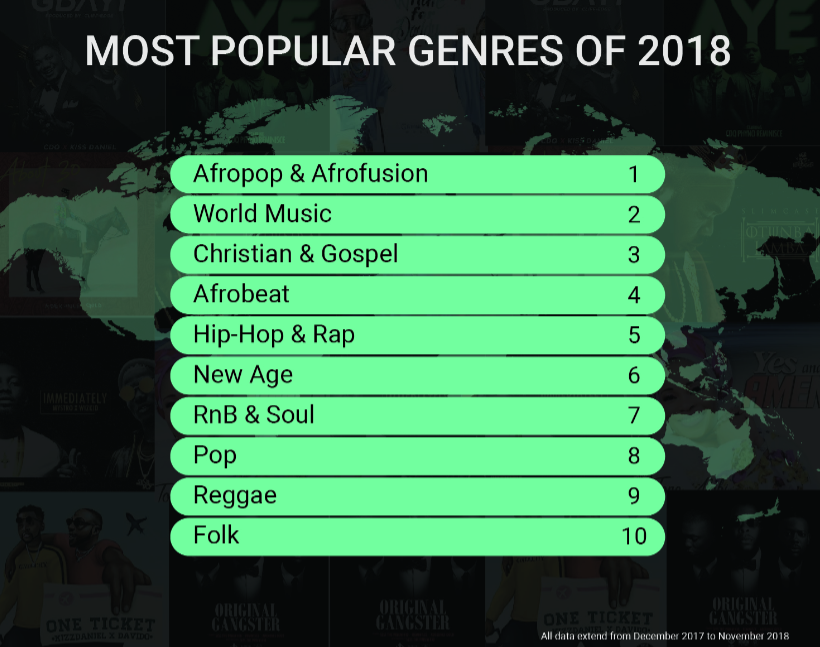 Afropop and Afrofusion was the most listened-to genre that dominated 2018, but Gospel music experienced a steep increase – with Tope Alabi being the most trending artiste of 2018.
