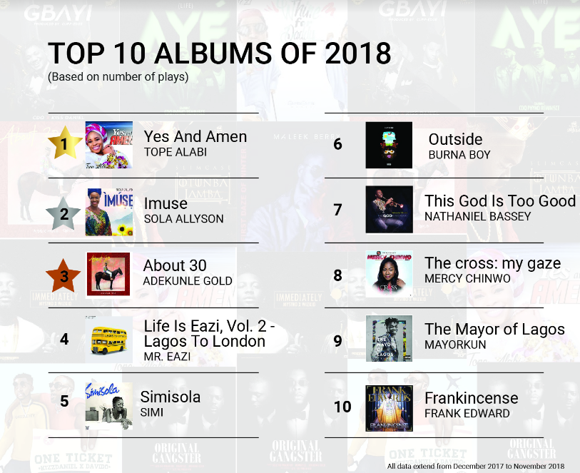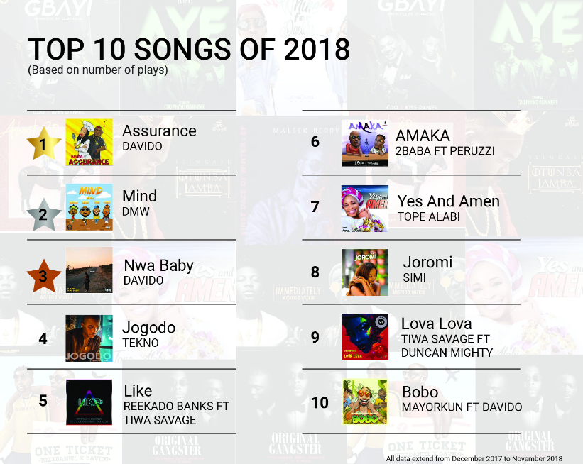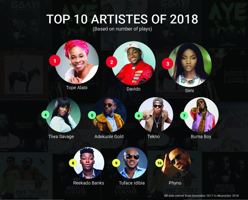 Tope Alabi not only tops the list as the best artiste of 2018 in Nigeria, but also claimed the spot for most album plays. Davido’s “Assurance” claimed the spot for most-played while “Mind” by DMW is the second most-played song in Nigeria.