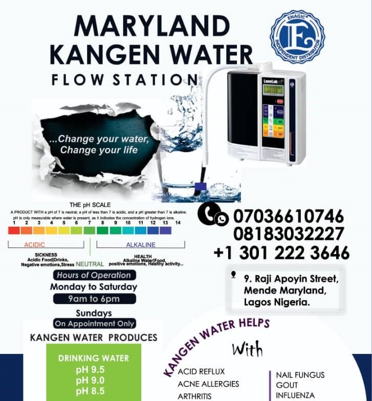 Located at 9, Raji Apoyin Street, Mende, Maryland, Lagos, Nigeria, Maryland KANGEN WATER is dedicated to providing you with accessible, life-changing water solutions. Our doors are open from Monday to Saturday, with Sunday appointments available to fit your busy schedule.