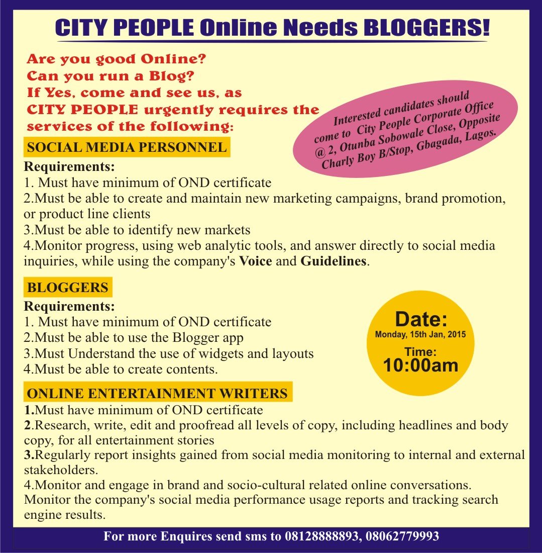 Are you social media savvy? How fast can you identify a story from scenes, event or encounter? How well do you write..? Join our team @ City People if you meet any of these demands and size the opportunity to become part of a dynamic online venture with excellent career prospects.