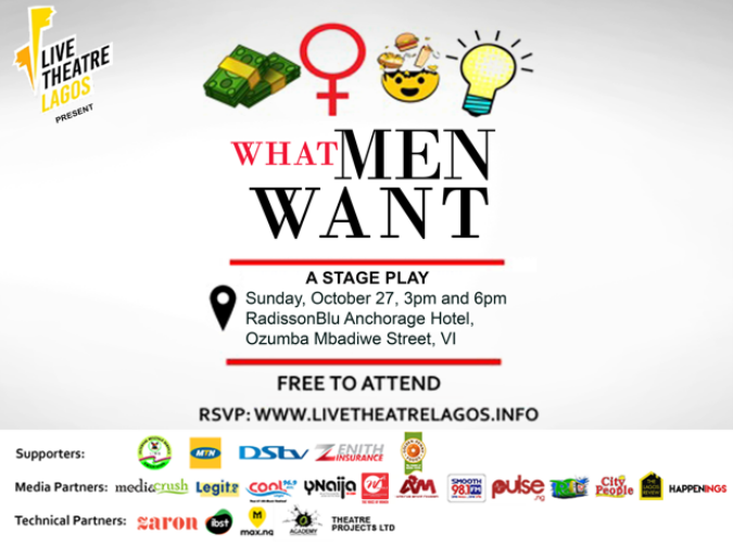 What Men Want is directed by Ajibola Fasola, stage managed by LakeShow and produced by Adenugba Oluwanishola for Live Theatre Lagos with Make-up design by Kemisola Isijola and Costume design by Tobiloba Apelegan and Props and Set design by Ralph Ajayi and hosted by Desmond Ekunwe.