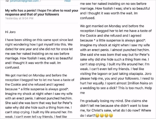 A man has cried out to relationship blogger, Joro and his audience about his wife who he claims has a penis. He had this to say;
