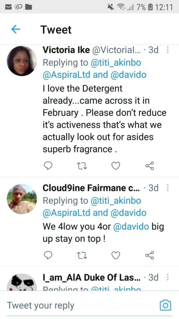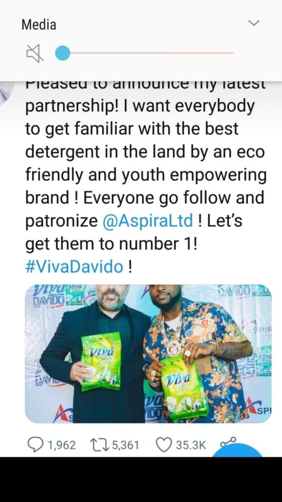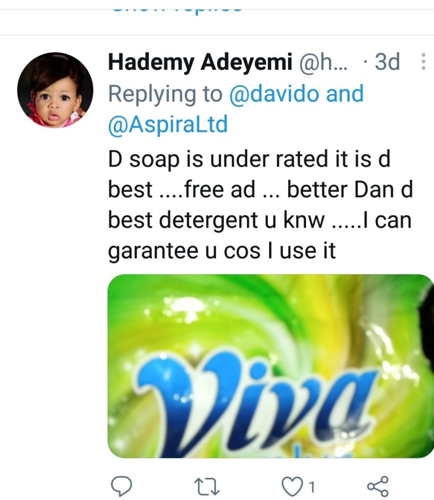 And Davido, his fans and Aspira Ltd themselves have been giving Viva Plus detergent a lot of publicity online especially on Twitter as shown below