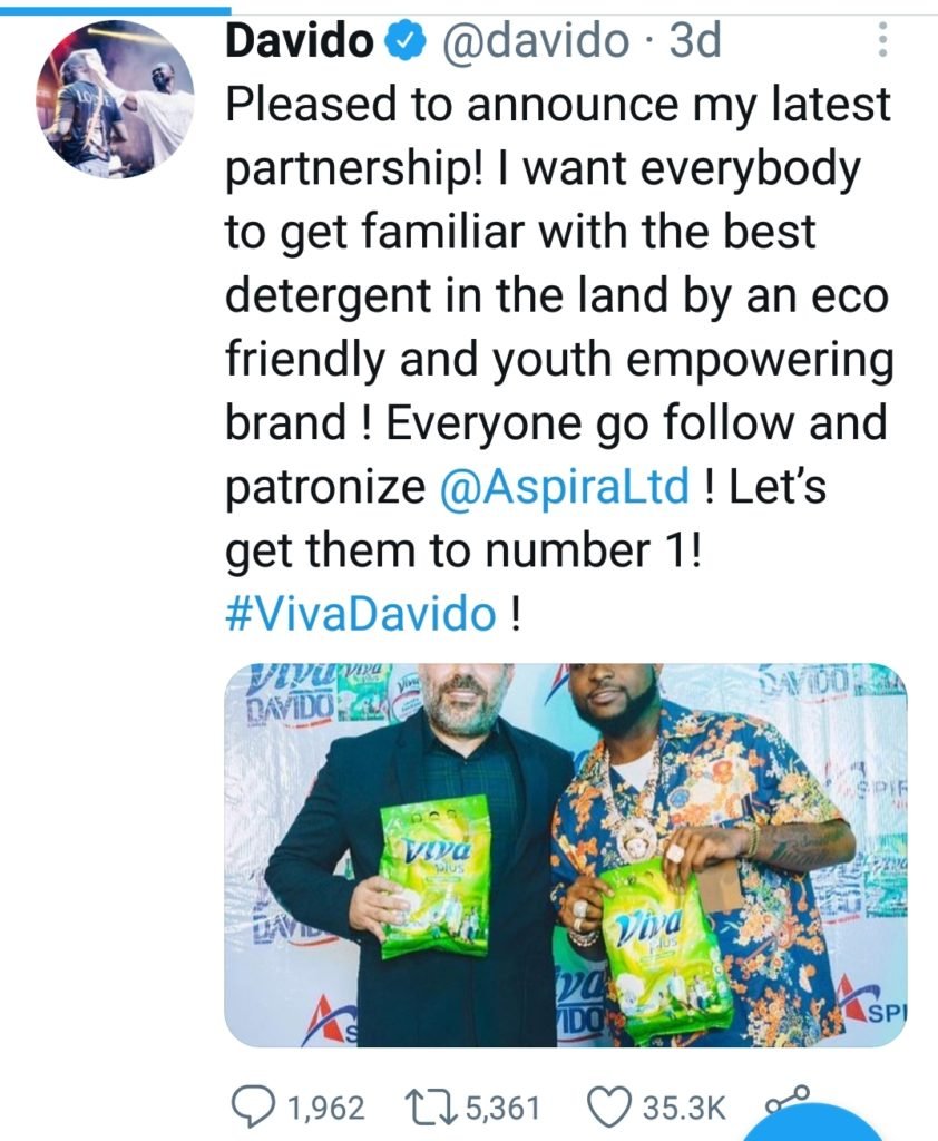@Davido: Pleased to announce my latest partnership. I want everybody to get familiar with the best detergent in the land by an eco-friendly and youth empowering brand. Everyone go follow and patronize @AspiraLtd.Lets get them to number 1!#VivaDavido!