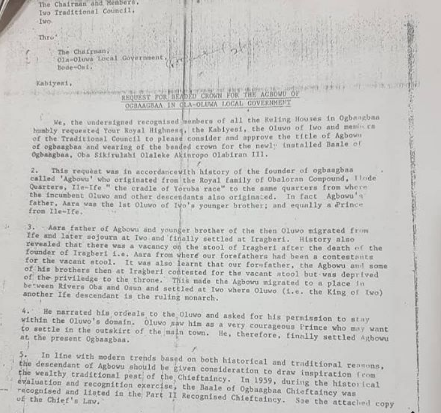 Attached therein was a letter written and signed by the then Baale of Ogbaagba (the same Sikirulahi Olaleke Akinropo) requesting for a beaded crown from Oluwo and as well narrating how they (Ogbaagba) seek for permission to settle within Iwo domain.
