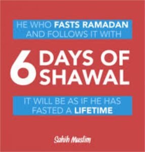 “Whoever fasts the month of Ramadan and then follows it with six days of fasting in Shawwal, it will be as if they have fasted for a whole year.” (Sahih Muslim)