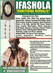 Ifasola Traditional Herbalist Centre, based in Igunshe Village, Ondo State, is renowned as it caters to individuals grappling with issues of ailments such as Poison, Syphilis, piles waist pain, becoming rich without ritual, weak erection, long-time pregnancy, quick ejaculation, hotness of the body, spiritual bad dream, business boom, irregular menstruation, fibroid, gonorrhoea, small organ, impotence, good eye, stomach problem, diabetes, stroke, collecting debt without stress, body pain, cough, love power, spiritual husband/wife, low sperm count, infections, Asthma, Appendices, Goodluck contract winning charm and more.
