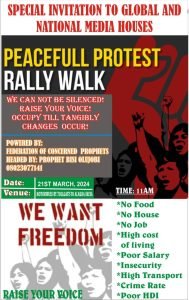 The much anticipated, necesitated peaceful protest and rally walk under the Federation of Concerned Prophets, lead by renow nedInternational Seer, Prophet Bisi Olujobiis billed to hold in Lagos, at the Freedom Park, Ojota Lagos on 21st March, 2024 between the time of: 11am and Abuja at, Eagle Square, CBD on 28thMarch, 2024 between the time of 11am, respectively.