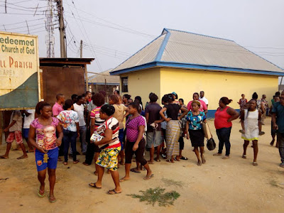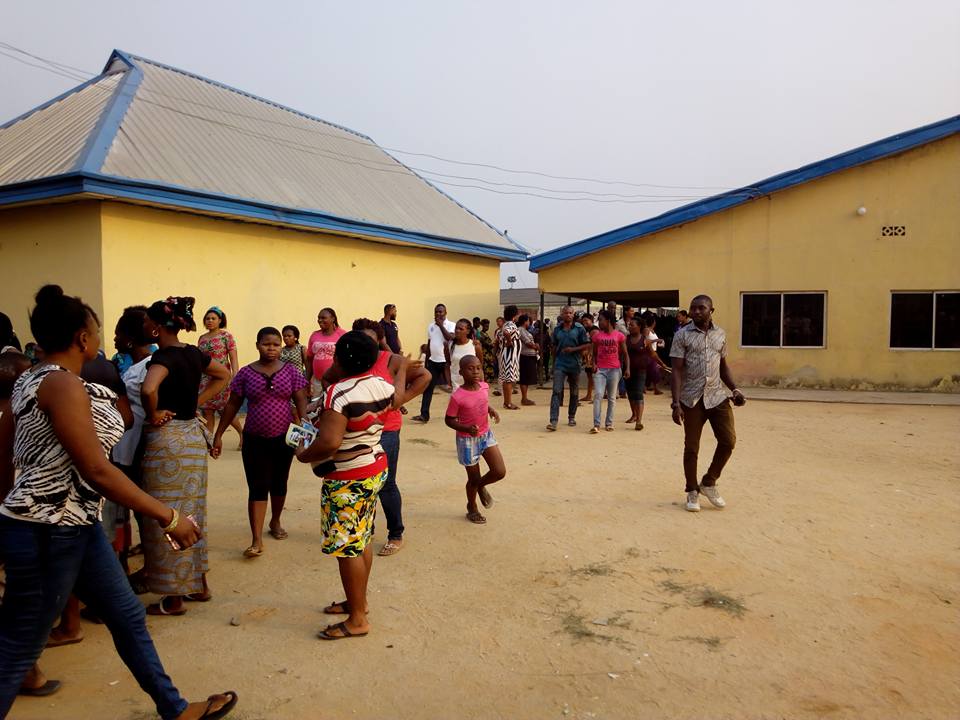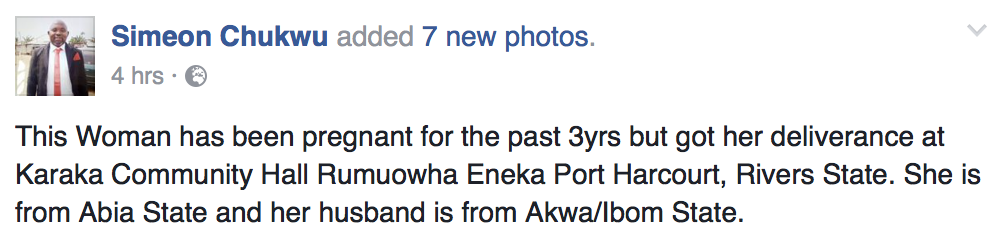 Facebook user, Simeon Chukwu, posed photos of a woman who had been pregnant for the past 3 years, but recently got delivered at Karaka Community Hall in Rumuowha Eneka area of Port Harcourt, Rivers State.
